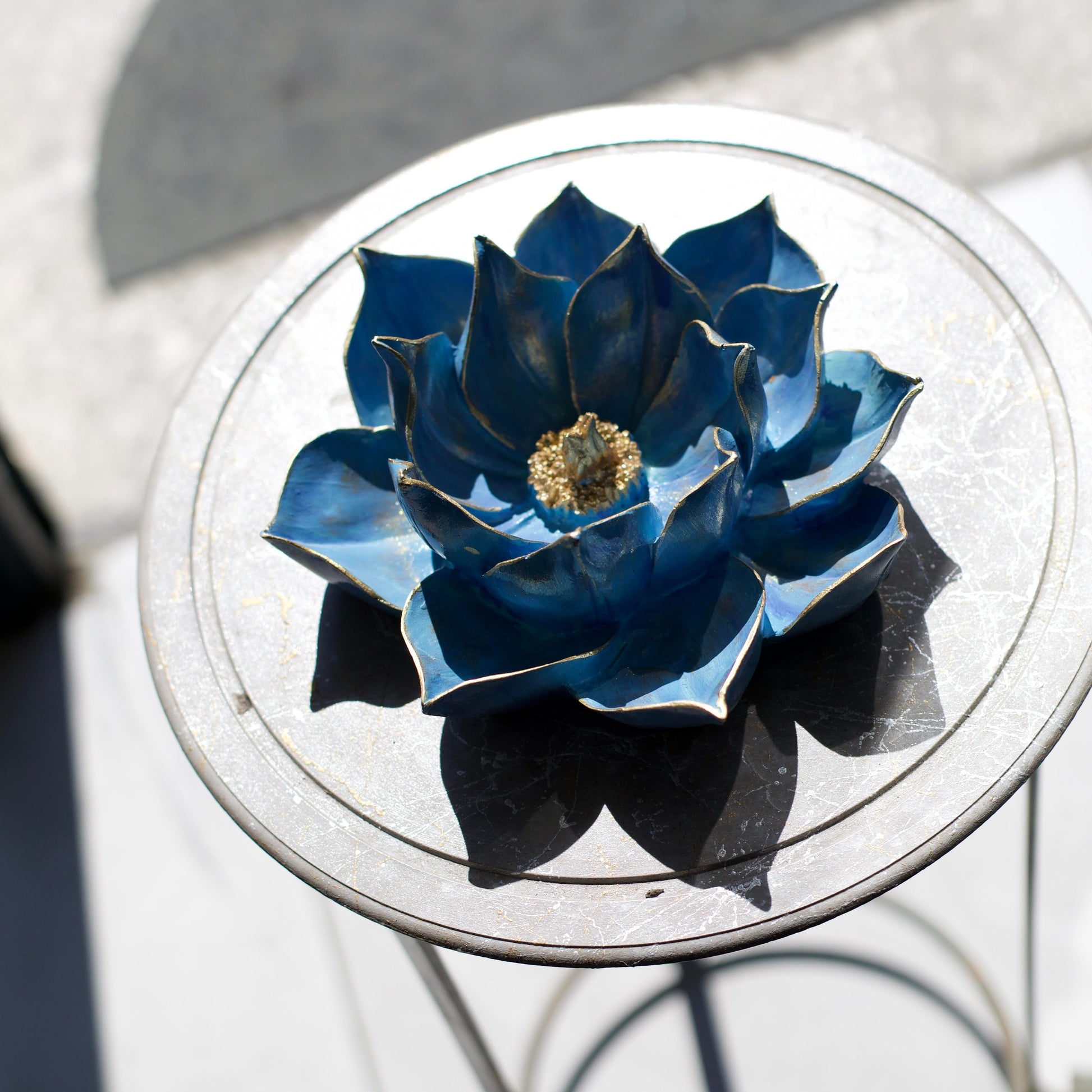 Handmade Celestia Blue Lotus Bloom Duo with Antique Gold Accents