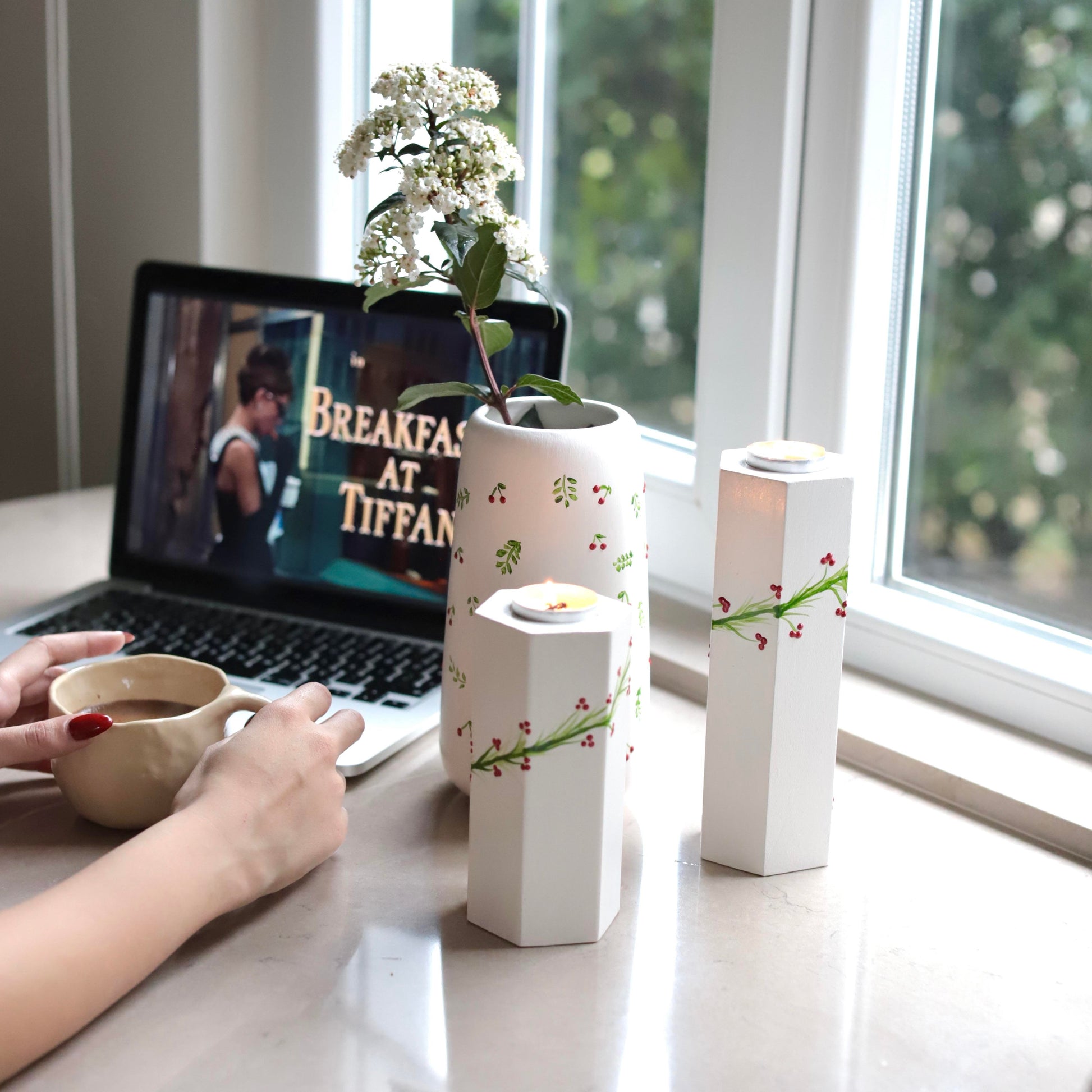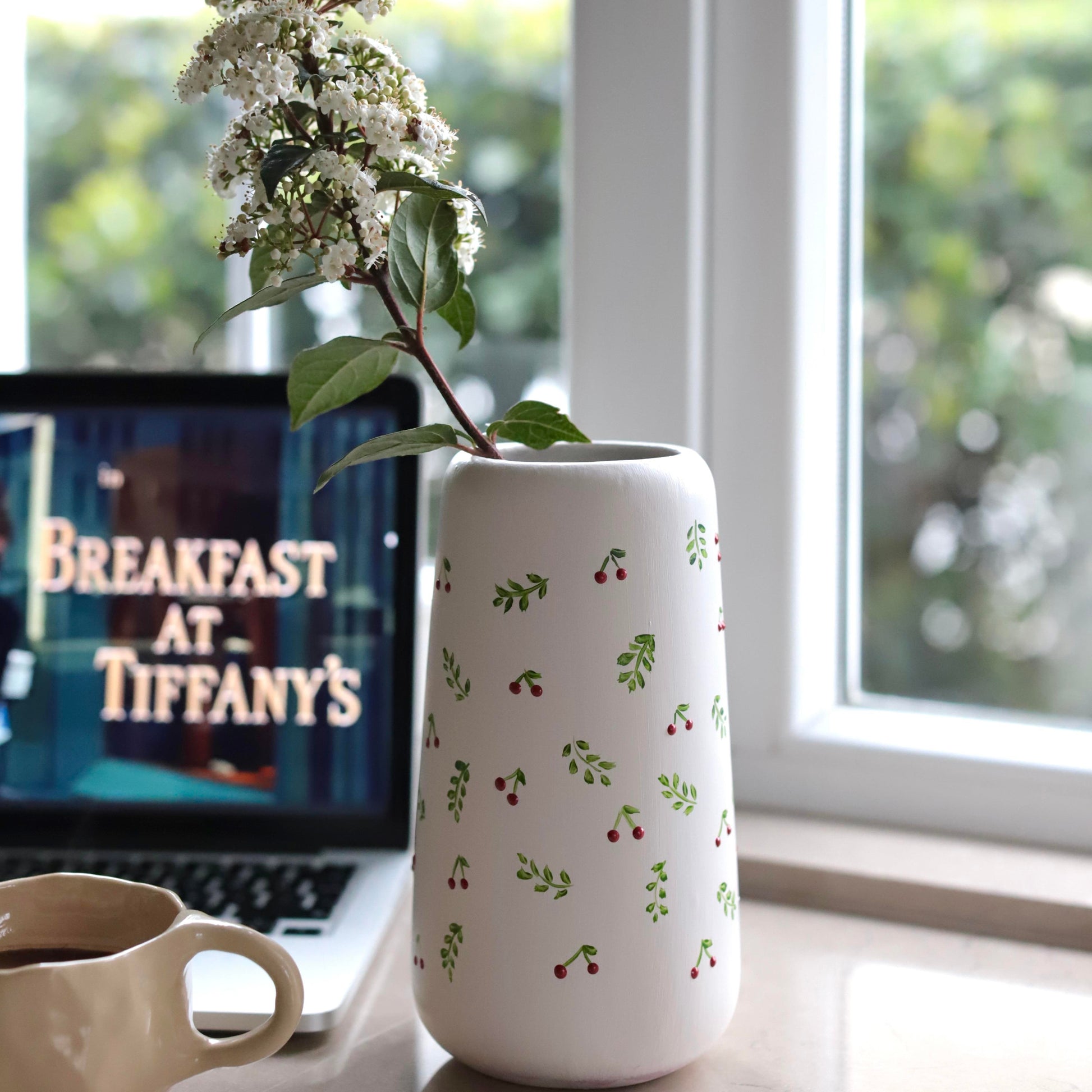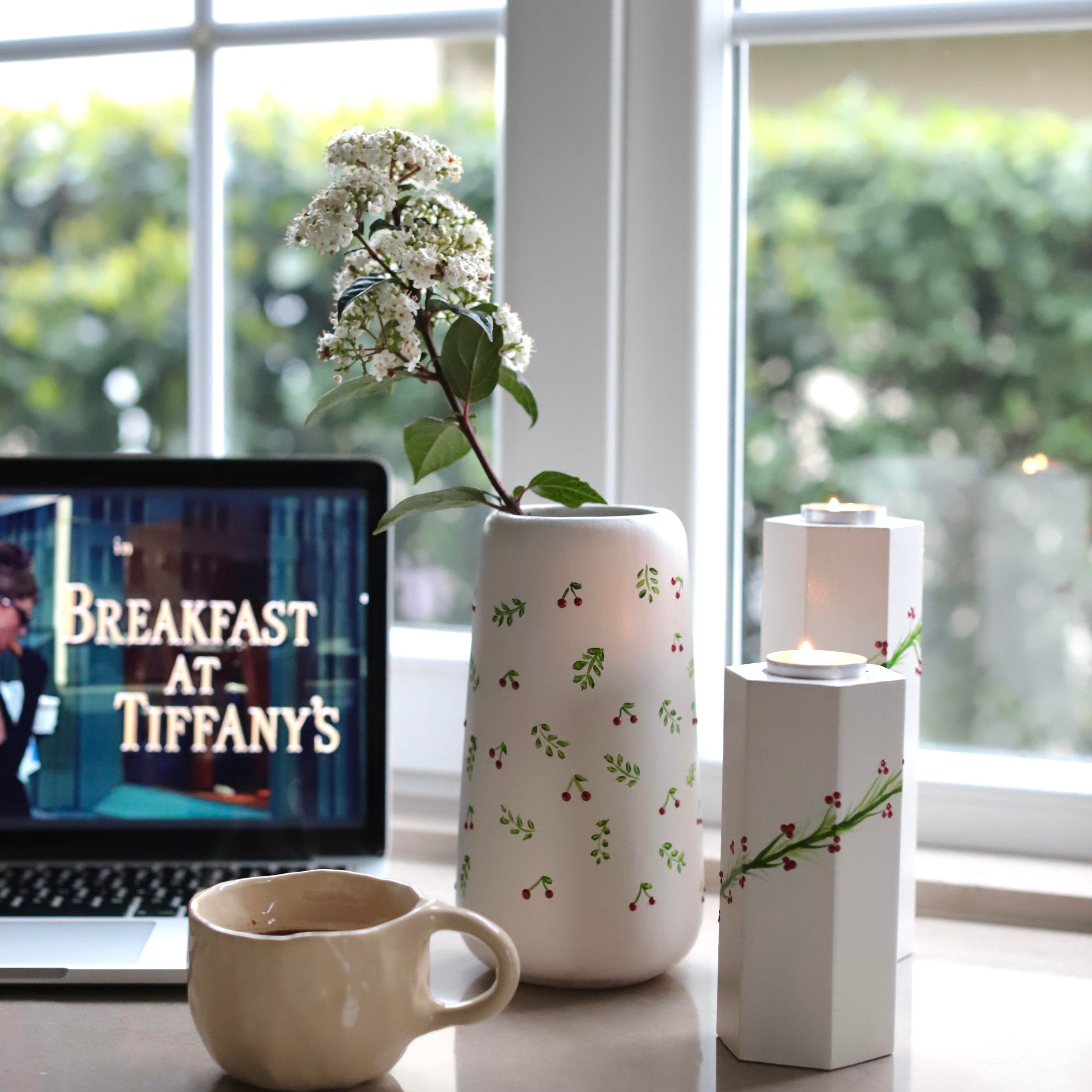 Minik Kirazlı Vazo Seramik El Yapımı Krem Yeşil Kırmızı 21cm