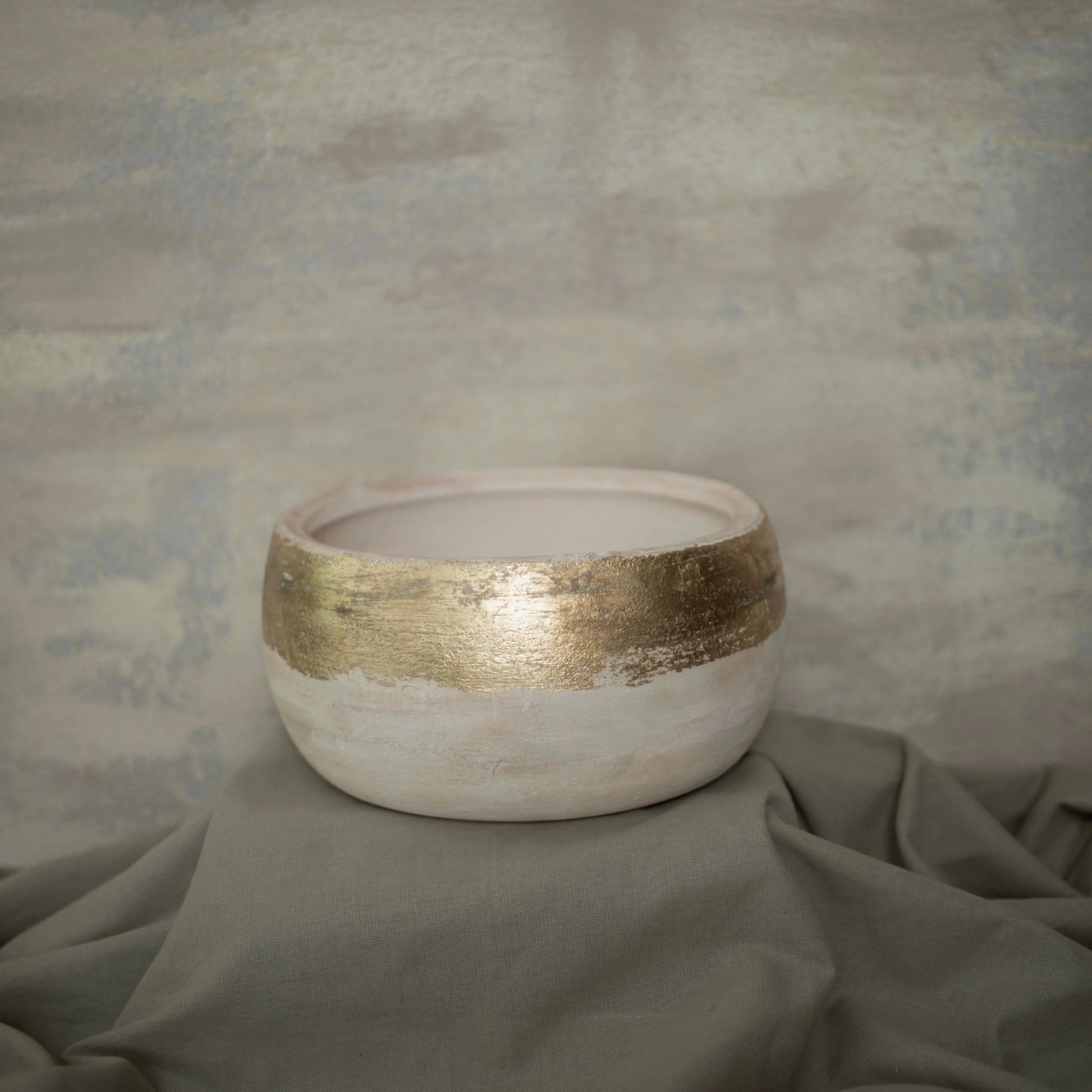 Boho Koleksiyon Seramik Altın Detaylı Büyük Çanak El Yapımı Kırık Beyaz Eskitme 24cm