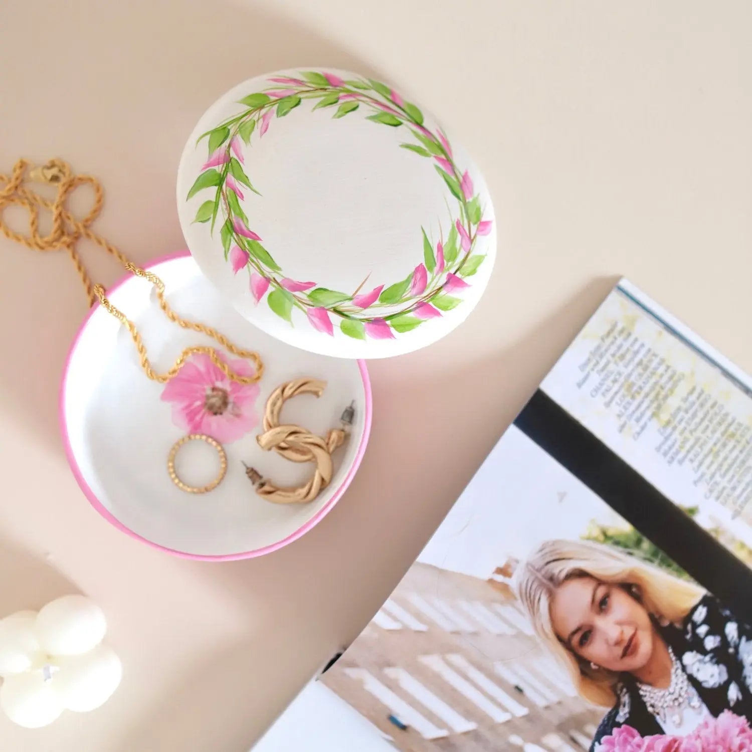 One Stroke Detaylı Kapaklı Takı Kutusu Seramik El Yapımı Beyaz Pembe Yeşil Ton 11cm